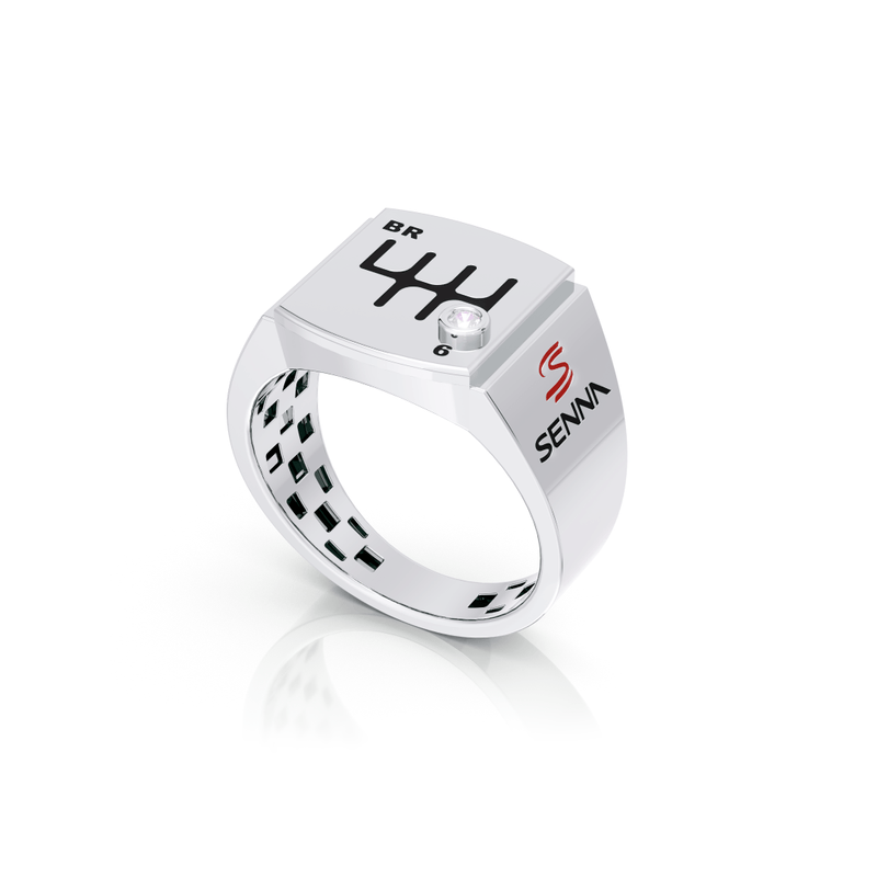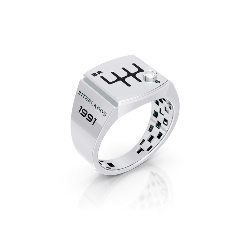 Este anel em ouro branco é uma homenagem à primeira lendária vitória de Ayrton Senna no GP do Brasil de 1991.
